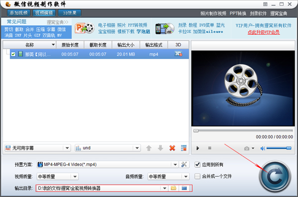 这个高级设置是我们的重点,所以讲解的时候文字多了一点,当我们的高级设置设置好后,我们就要对它进行转换,转换成我们需要的可以发送的微信视频。还要设置转换后的保存位置。在我们按下高级设置的确定之后,我们就选择‘输出目录’即可设置我们想要保存的位置。最后点击右下角圆形大按钮即可转换成我们需要的微信视频。如下图