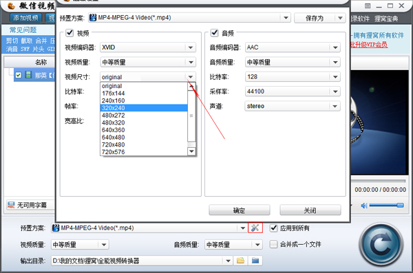 设置了视频的格式我会发现视频的体积减小了一下,但是它还远远达不到我们需要发送的体积,这该怎么办呢。这是一个常识问题,就像一个胖子,如果想要他体重变轻,那就必须要让他去掉一些东西或者减肥,去掉一些东西那就不完整了,肯定不行,那就只能减肥。所以咱们的软件刚好就是一个视频减肥器一样的东西,去缩小视频的尺寸。点击‘预置方案’对话框后面的扳手标志,然后弹出一个高级设置面板,里面有一个‘视频尺寸’功能,里面有很多尺寸规格,尺寸越小体积越小,然后确定即可。如下图