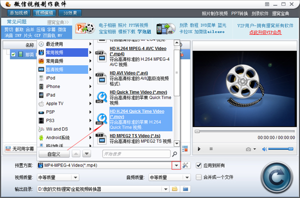 我们打开从上面下载下来的微信视频制作软件,点击软件左上角的‘添加视频’把我们拍下来的视频添加到软件当中,首先我们要做的是改变视频格式,这个格式也是会影响文件的大小的。像占空间最小的视频格式是avi格式,但是它会眼中影响视频的质量,一般建议大家采用flv、mp4、mov格式。我们这款软件有很多种格式可供大家选择。只需要点击‘预置方案’对话框后的三角形即可选择。如下图