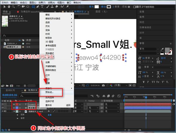 接着在电脑影像处理器左下方同时选中文字和矩形图层,只选中这两个图层哦,同时点击鼠标右键选中【预合成】,接着输入预合成名称并点击【确定】即可,这里原文字有移动效果,所以需要来进行文字运动跟踪~