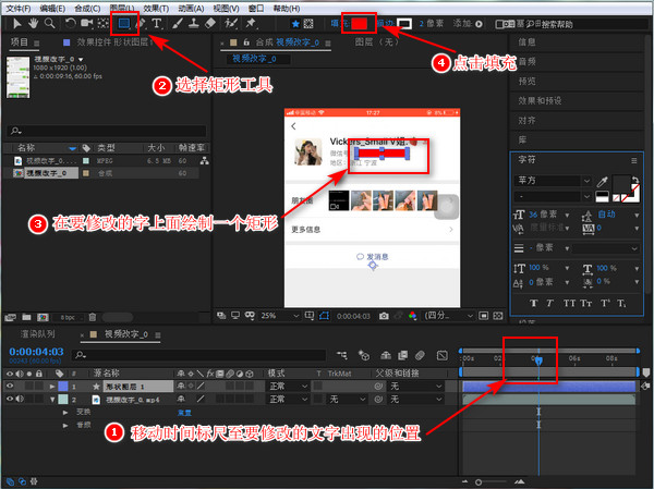 移动右下方时间标尺至要修改的文字完全出现的位置,在上方的工具栏中选择【矩形工具】,再在视频画面中要修改的文字处,绘制一个矩形,矩形要覆盖在文字上,大小要比文字稍微大一点,接着点击上方填充旁边的色块。