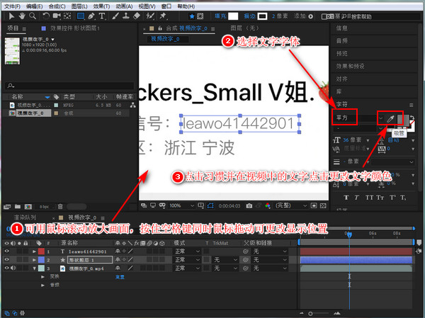 可以使用鼠标的滚轮放大电脑影像处理器的视频编辑画面,按键盘空格键并鼠标点击拖动画面可更改画面显示位置。在右侧可更改文字的字体,然后点击【吸管】,在视频中其他的的文字上点击,获取文字的颜色。