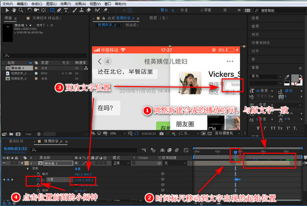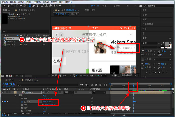 文字位置调整完成点击【位置】前面的【小闹钟】即时间变化秒表。时间标尺往后移动一点点,看到文字没有覆盖在原文字上面,就重新调整文字的显示位置,使其完整的覆盖在原文字上方,时间标尺再往后移动一点。