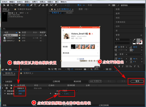 接着在电脑影像处理器下方出现的渲染队列页面中,可以进行渲染设置以及输出模块设置,点击【输出名称】旁边的蓝字可以更改视频输出名称和输出路径,接着点击【渲染】开始导出视频,等待视频导出完成即可。