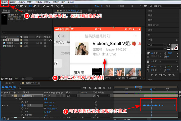 慢慢的移动时间标尺,发现文字没有完整的覆盖就再次调整合成的位置,知道全时间段的文字都完整的覆盖在原文字上,点击键盘的空格键可播放预览视频效果,预览无误点击【文件】—>【导出】—>【添加到渲染队列】。