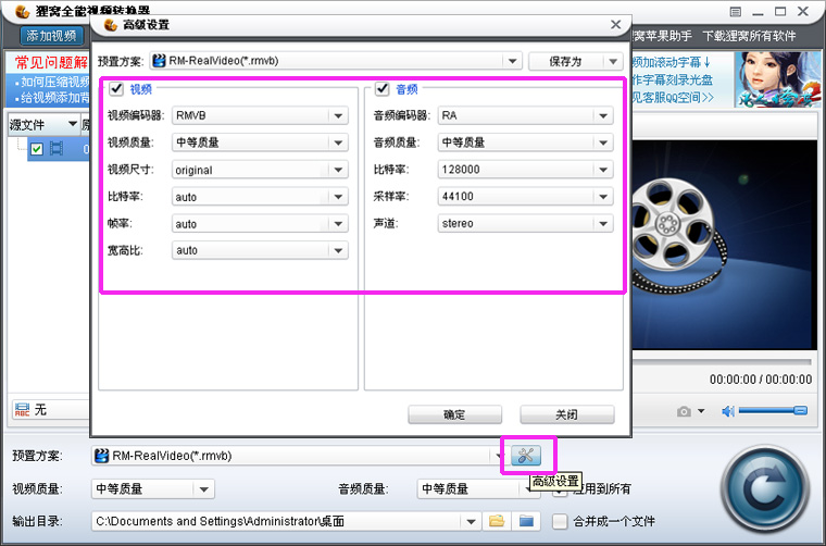 3.格式选好之后,如果你要对视频进行参数配置的,在这里点击“高级设置”按钮(如:视频编码器、视频尺寸、帧率、比特率等等),如下图: