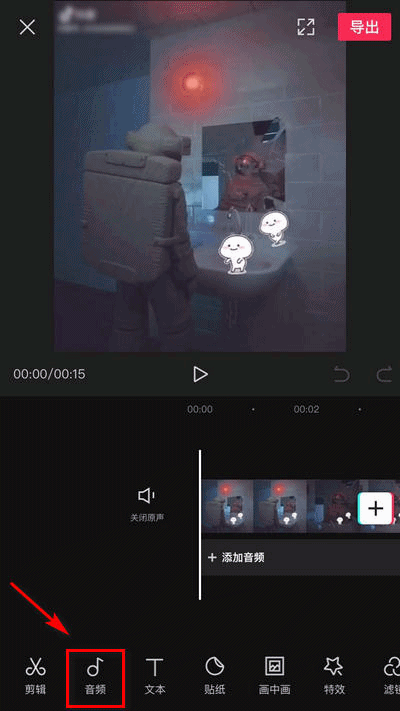 添加完视频就会出现一个功能选择页面。可以看到在最下面有一排文字选择都是功能对应的文字总结。我们点击‘音频’就会出现关于音频的功能选择。选择‘音乐’。