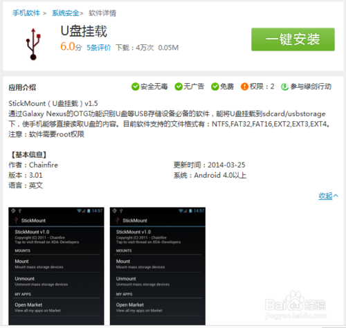 第二步,我们可以通过手机助手下载一款叫U盘挂载的软件,我们进行安装。(2014年出品的手机直接连接手机会自动识别)