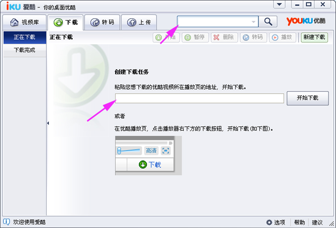 2.在爱酷的界面上点击左上角的“下载”按钮,然后就可以在上面的输入框上,输入你要下载电影的网址。或者你也可以直接在上面搜索框上直接输入要下载电影的名称。