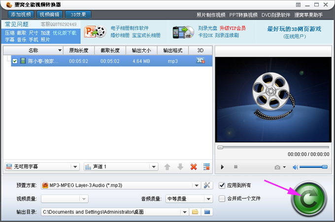 第二步:利用狸窝全能视频转换器转换MP3格式: